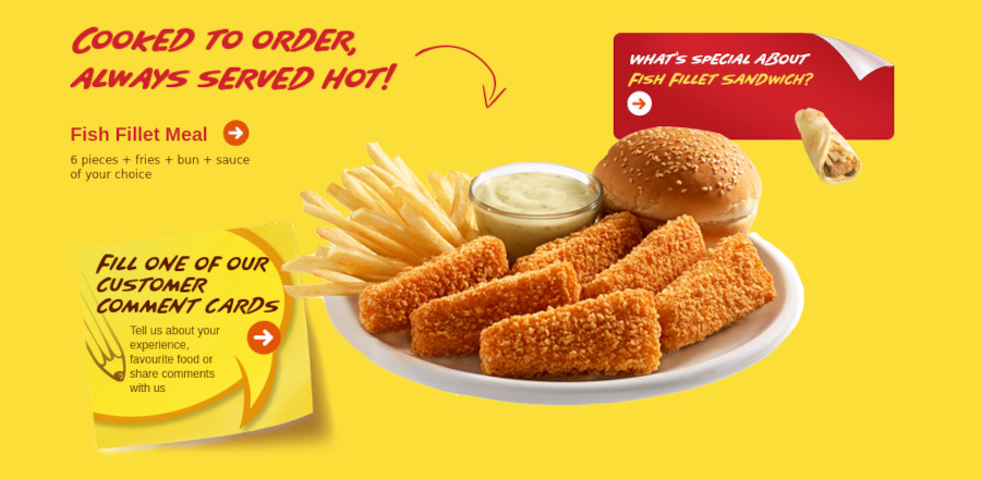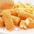 10 spicy fish fillet fingers served with fries, a bun, and 2 tartar sauces