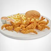 10 Pcs Chicken Fillet Nuggets Regular Crunchy to perfection Includes bun, fries, and 2 Nuggets sauces.