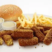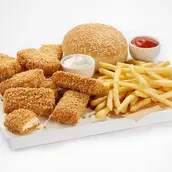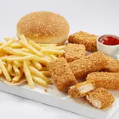 10 Pcs Chicken Fillet Nuggets Regular Crunchy to perfection Includes bun, fries, and 2 Nuggets sauces.