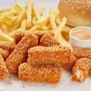 7 Piece Chicken Nuggets Meal Crunchy to perfection Includes a bun, fries, and 2 nuggets sauces