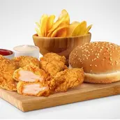 5 Crispy Chicken Breast Pieces Boneless & Skinless Includes a Bun, ALBAIK Chips, Nugget Sauce and Garlic Sauce.